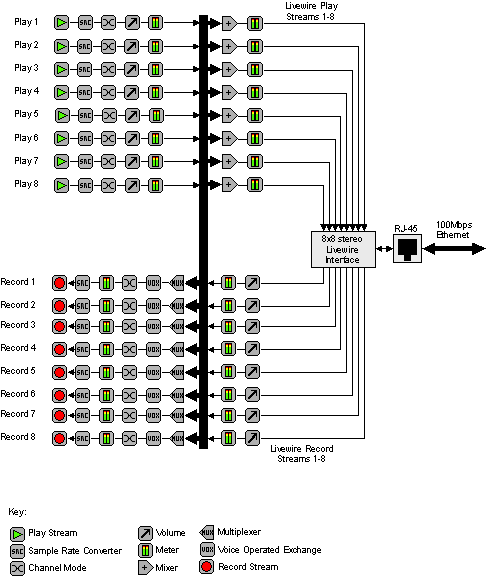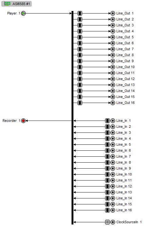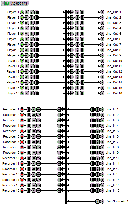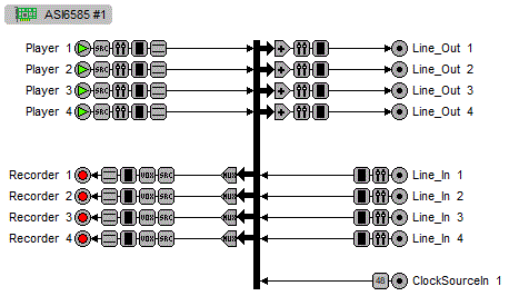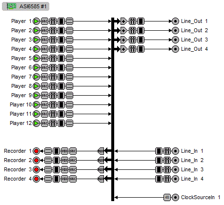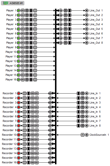 Providing up to 16 play streams that are mixed to 8 stereo outputs and up to 16 record streams fed from 8 stereo inputs, the ASI6685 features AudioScience's unique "anything to anywhere" mixing and routing.