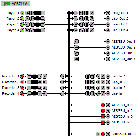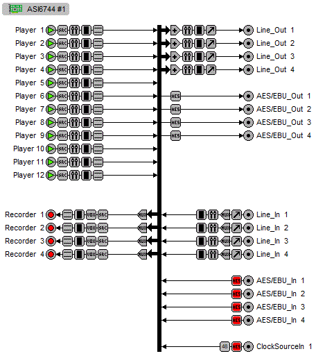 Providing 12 play streams that are mixed to 4 balanced stereo outputs and 8 record streams fed from four balanced stereo inputs, the ASI6740 and ASI6744 feature AudioScience's unique "anything to anywhere" mixing and routing.
